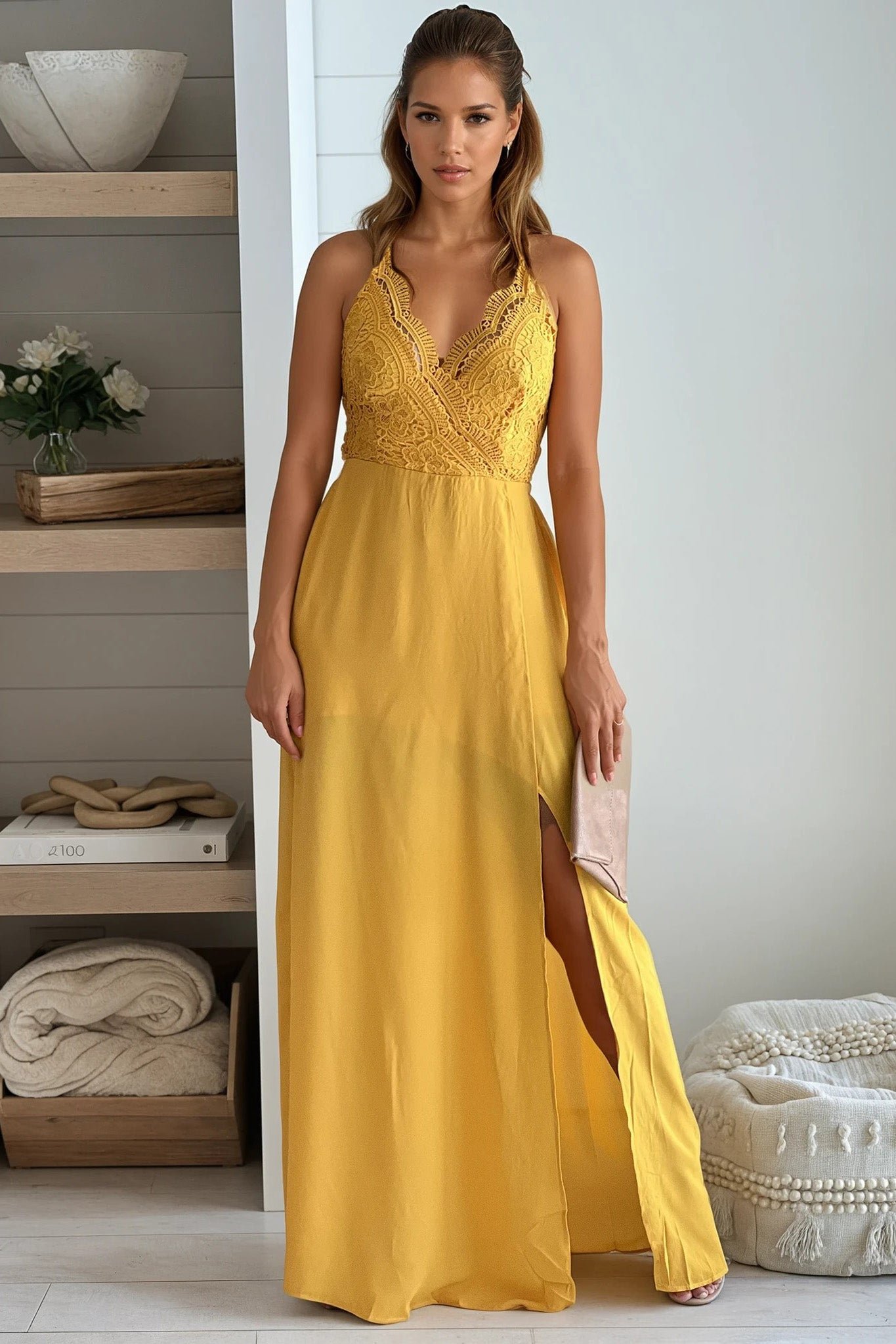 Elevate your style with this Mustard Crochet Top Maxi Dress, featuring a flattering side slit, criss-cross back, and wrap-style skirt. Designed for a perfect fit, it includes built-in shorts and adjustable straps for comfort. Crafted from 100% polyester, this sleeveless dress is hand washable and offers a true-to-size fit.
