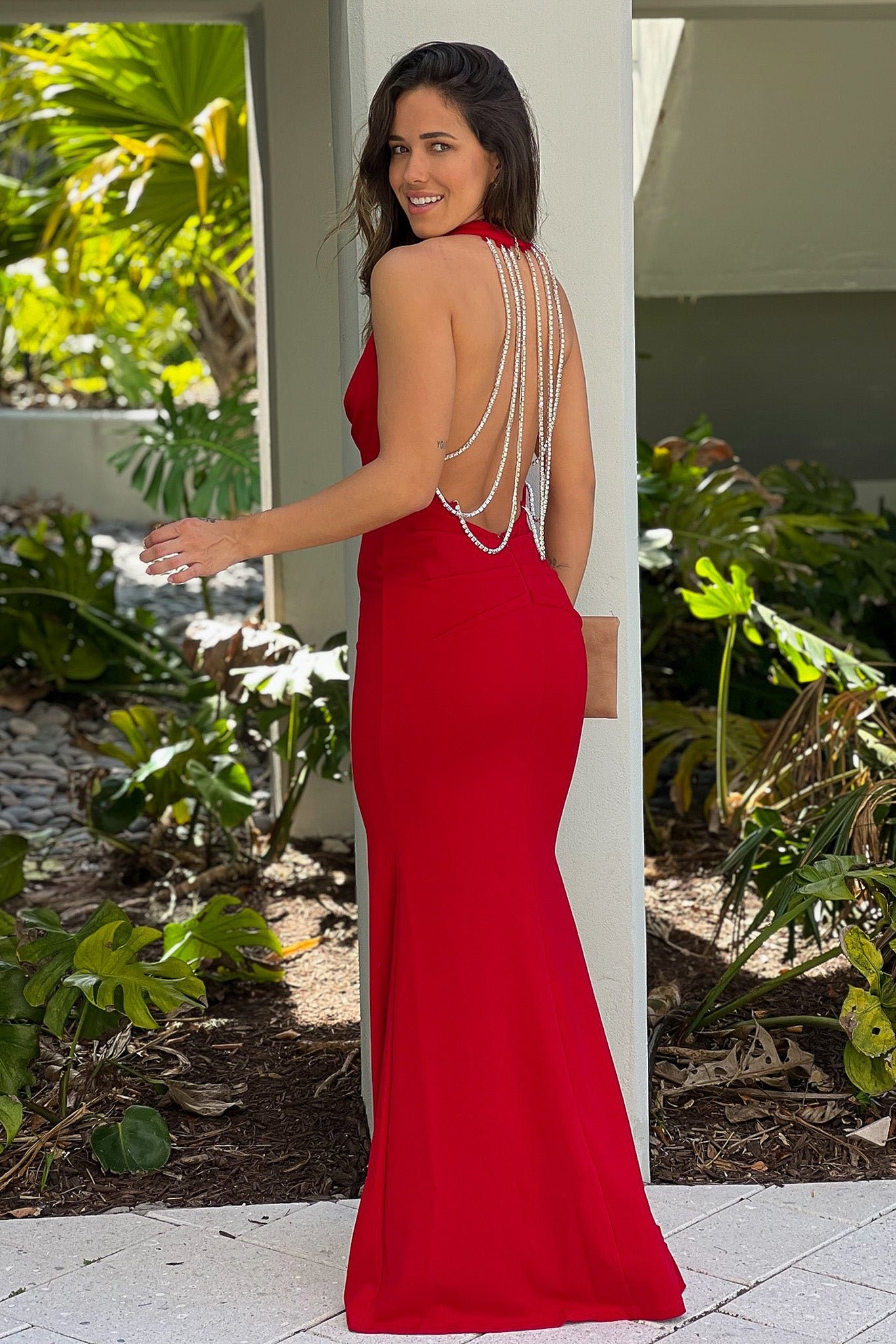 Elevate your special occasion style with this stunning Red Maxi Dress featuring a rhinestone multi-strap back design. Crafted from a comfortable polyester-spandex blend, this dress offers a flattering fit with a V-neck, halter neckline, and elegant front slit. Detailed with pleated accents on the top and back, it’s finished with a concealed back zipper. Available in red, sizes S, M, L. Model is 5’5″, wearing size Small. Hand wash cold, line dry.