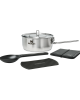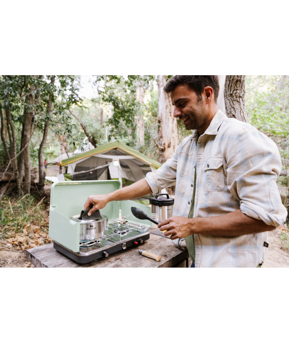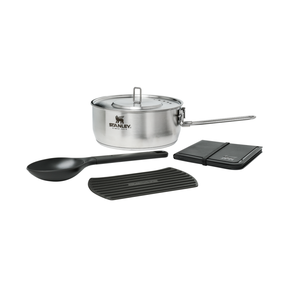 Discover the Stanley Adventure 6-piece cookware set made from high-quality 18/8 stainless steel, perfect for camping, travel, and everyday kitchen use. This professional cookware set features a 3-ply pot for even heat distribution, ideal for soups, stews, and complex dishes. The set includes a 1.9L saucepan, folding cutting board, silicone coasters, serving spoon, and stackable design for easy storage.