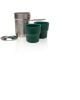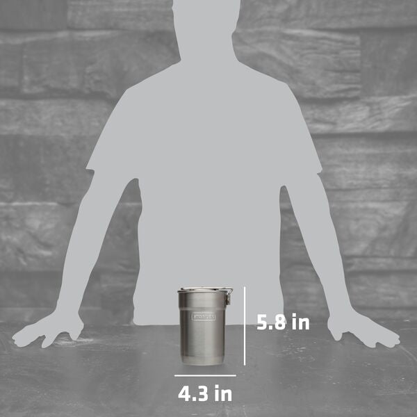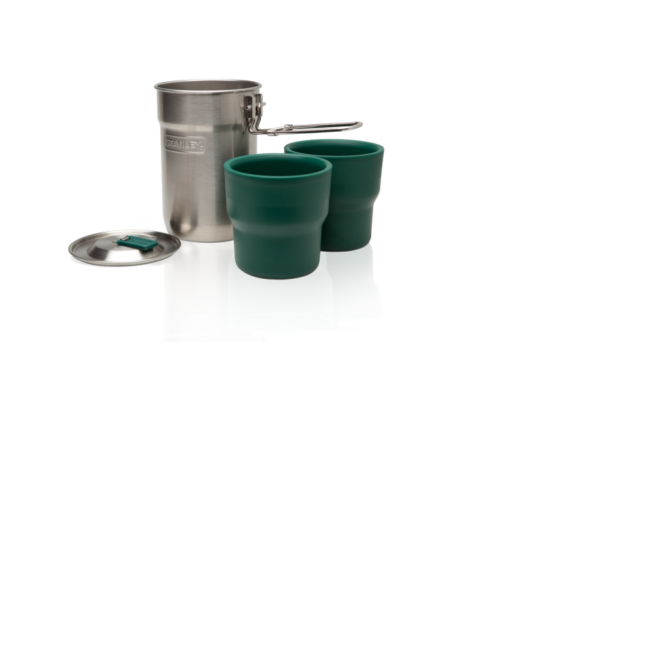 Prepare delicious meals anywhere with this durable and lightweight camping cookset. The 18/8 stainless steel pot with a locking handle is perfect for brewing coffee, heating soup, or cooking over a camp stove or open flame. The versatile ventilated lid functions as a coffee filter and ensures even cooking. Includes two nesting 10 oz (295 ml) thermal mugs for sharing warm drinks on outdoor adventures. Compact, stackable design with a slim profile fits easily into a backpack. Dishwasher safe for easy cleanup.